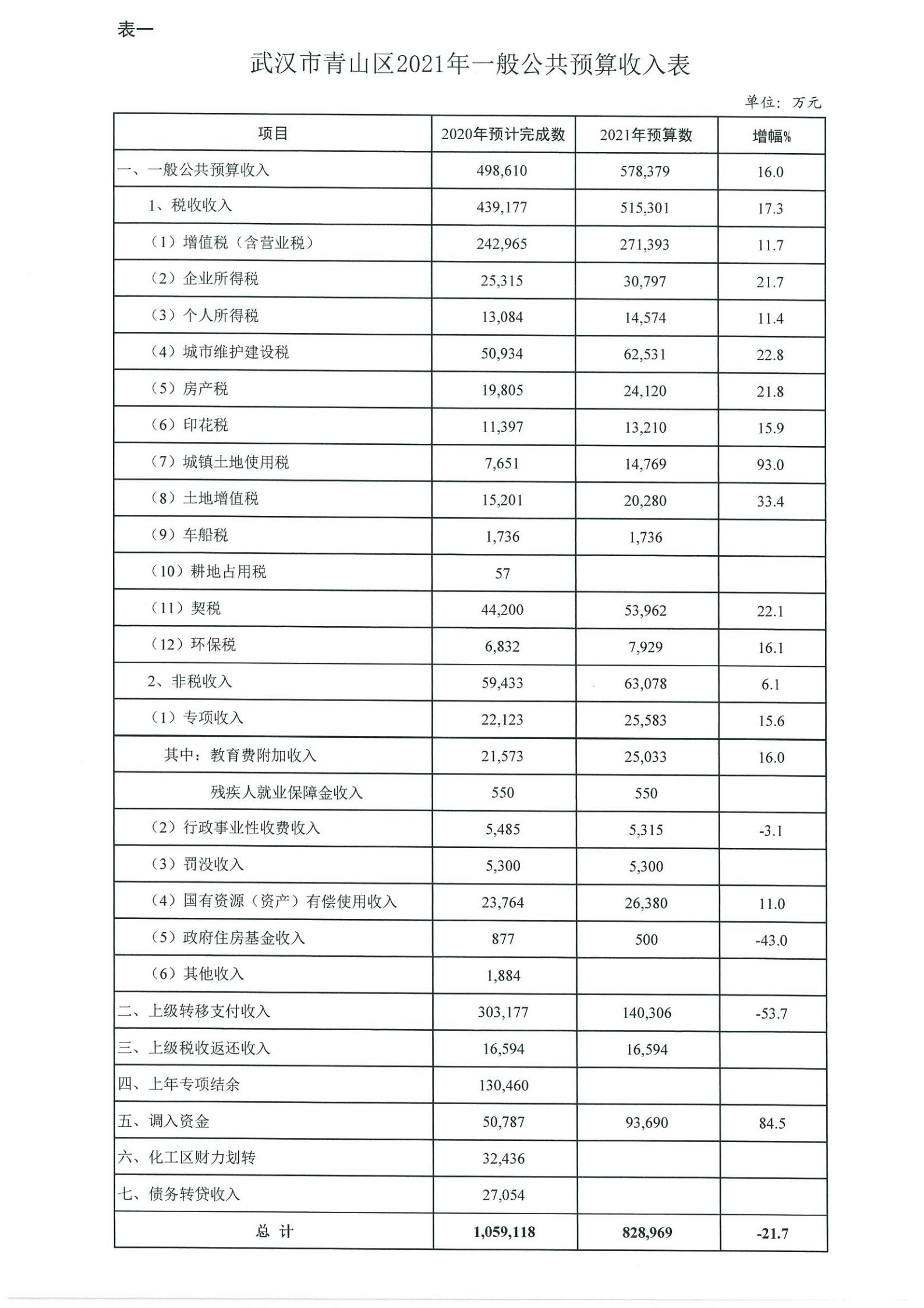表一、武汉市青山区2021年一般公共预算收入表