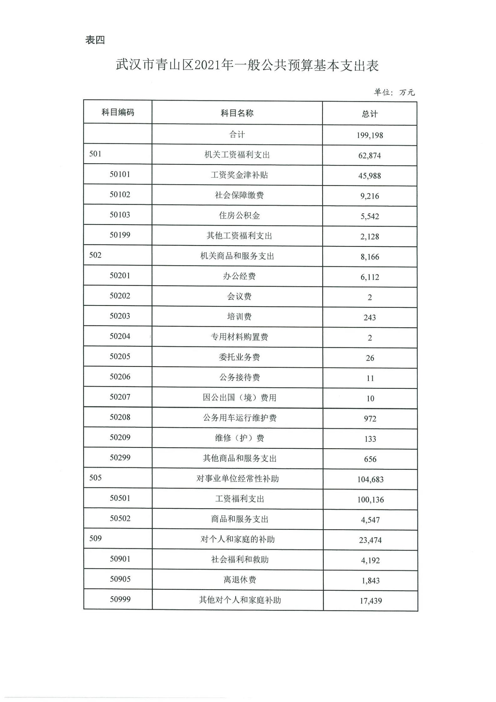 表四、武汉市青山区2021年一般公共预算基本支出表