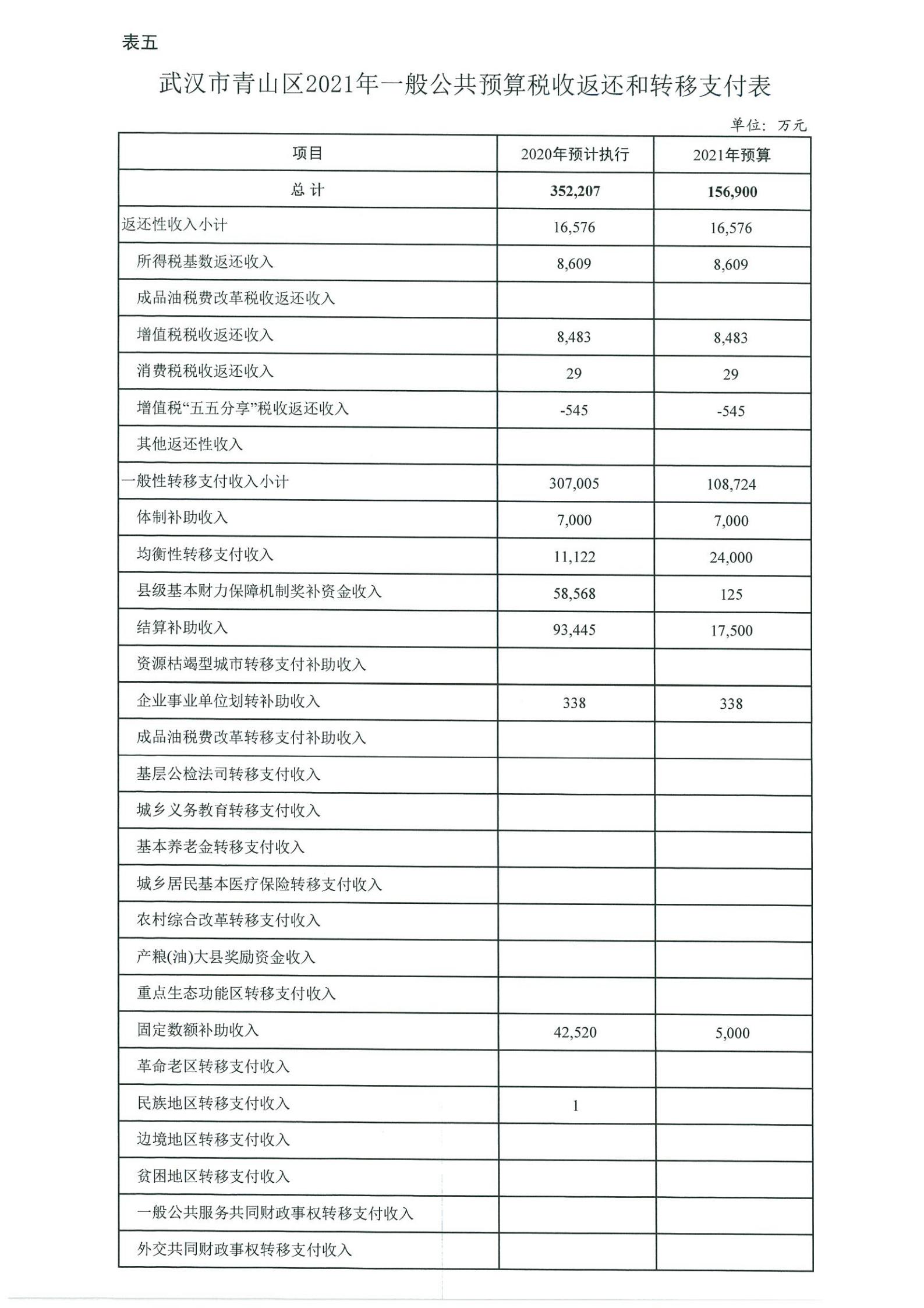表五、武汉市青山区2021年一般公共预算税收返还和转移支付表