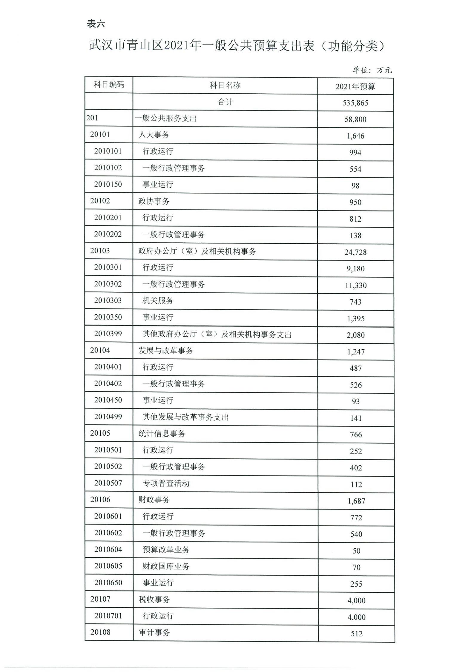 表六、武汉市青山区2021年一般公共预算支出表(功能分类)