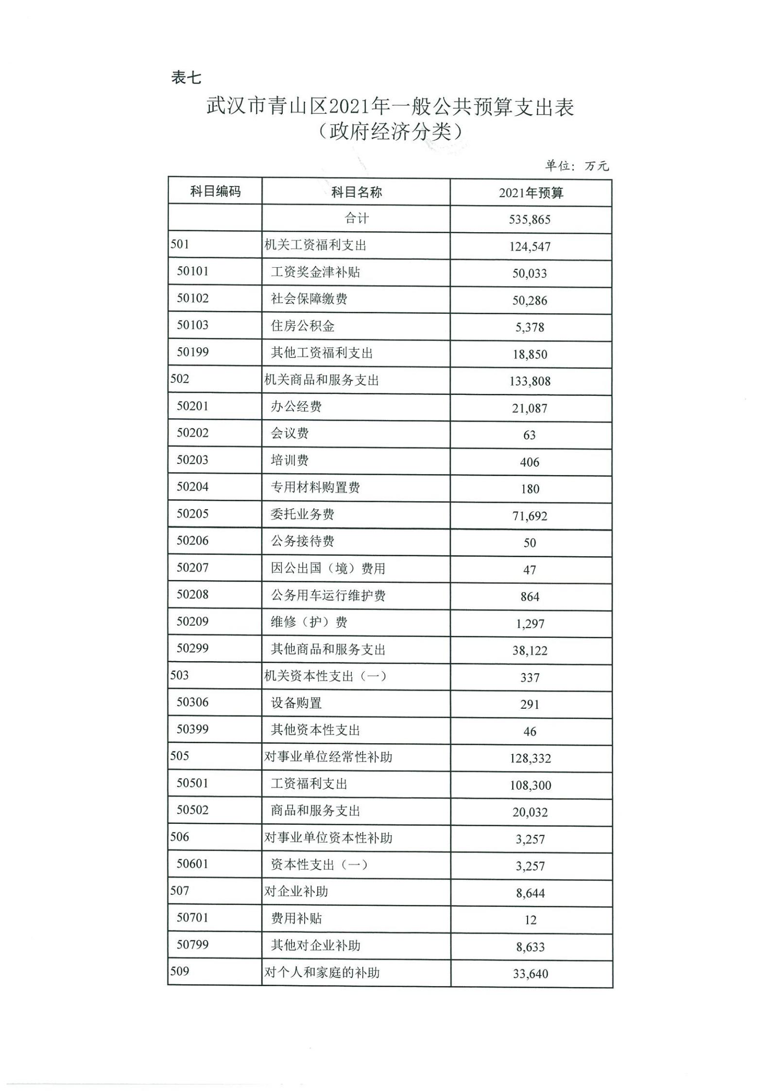 表七、武汉市青山区2021年一般公共预算支出表(政府经济分类)