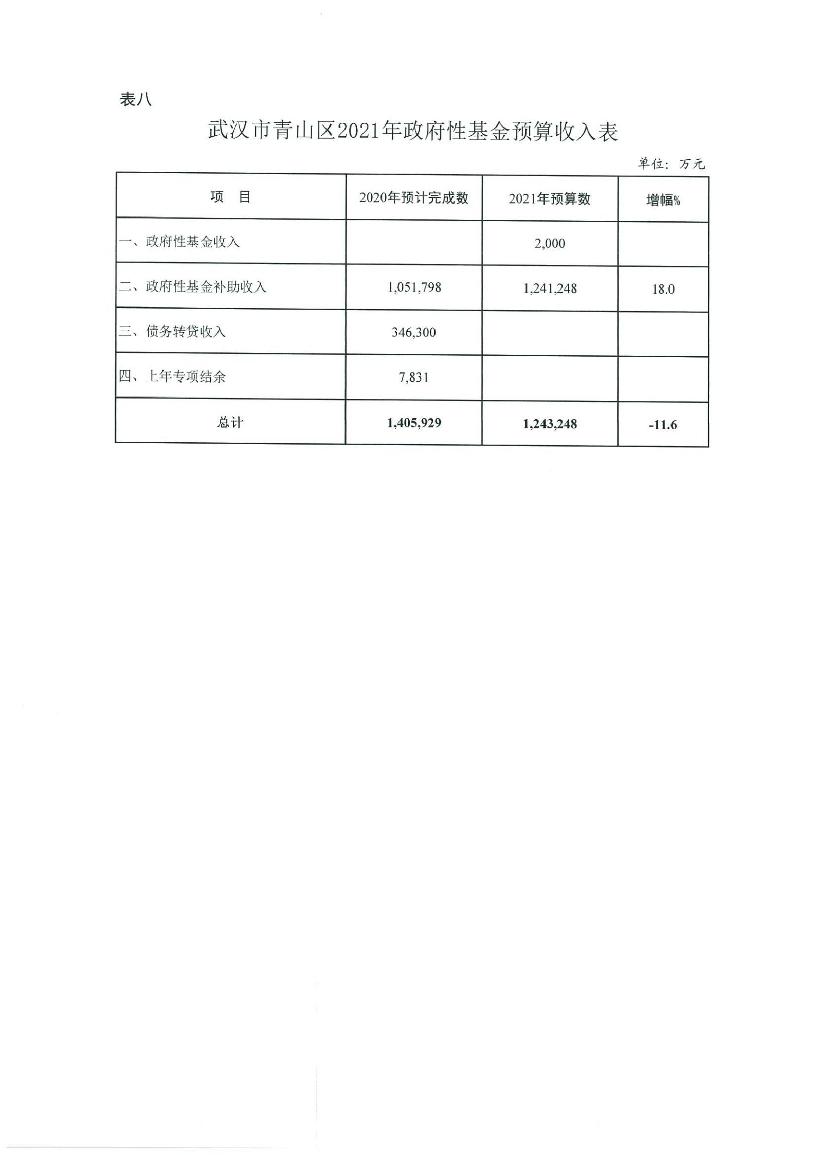 表八、武汉市青山区2021年政府性基金预算收入表