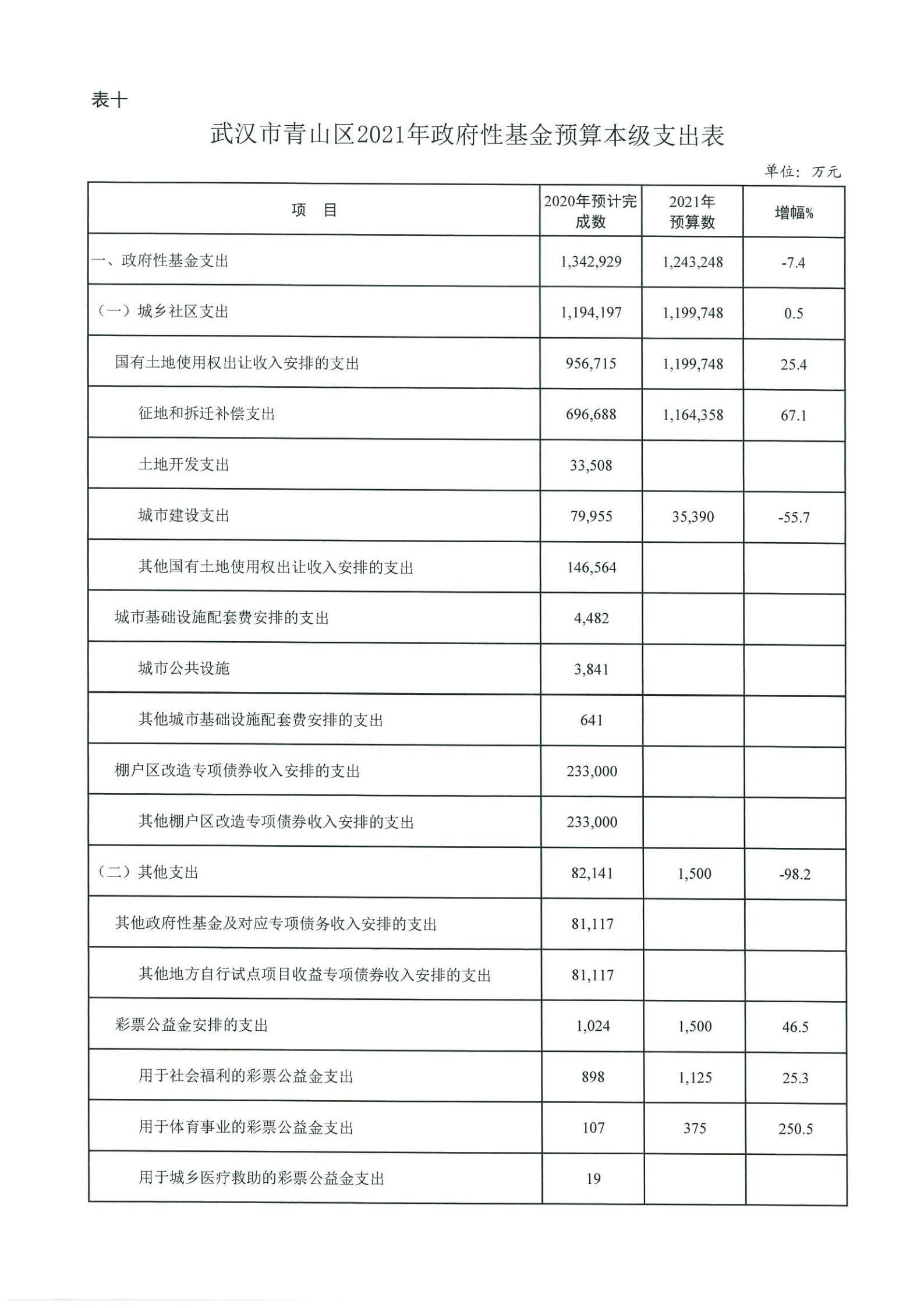 表十、武汉市青山区2021年政府性基金预算本级支出表