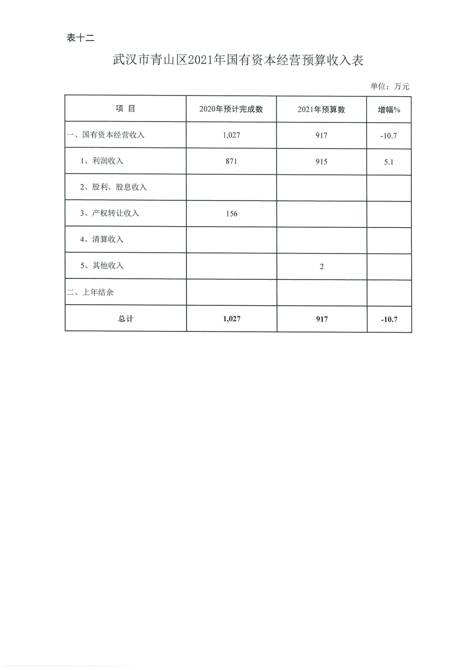 表十二、武汉市青山区2021年国有资本经营预算收入表