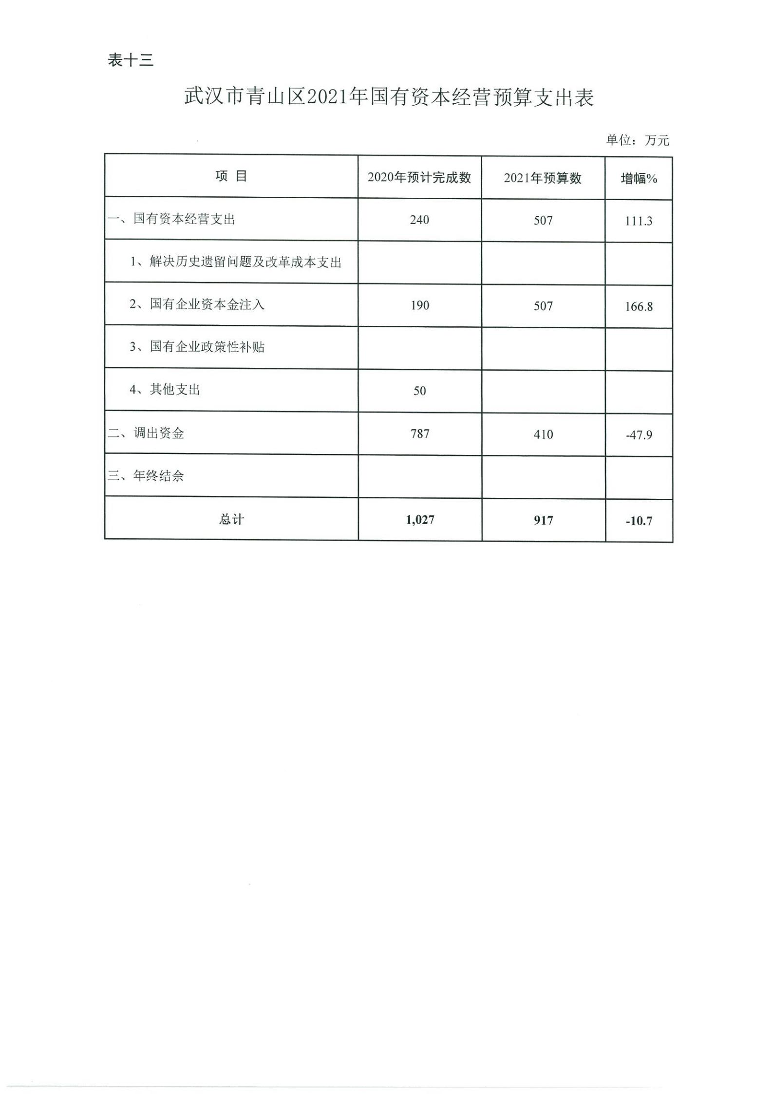 表十三、武汉市青山区2021年国有资本经营预算支出表