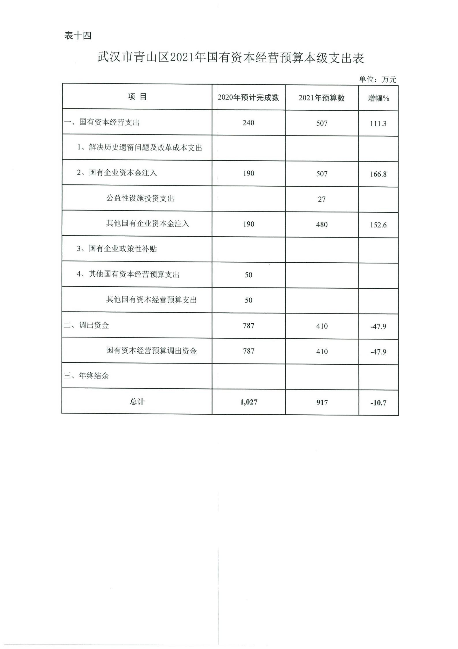 表十四、武汉市青山区2021年国有资本经营预算本级支出表