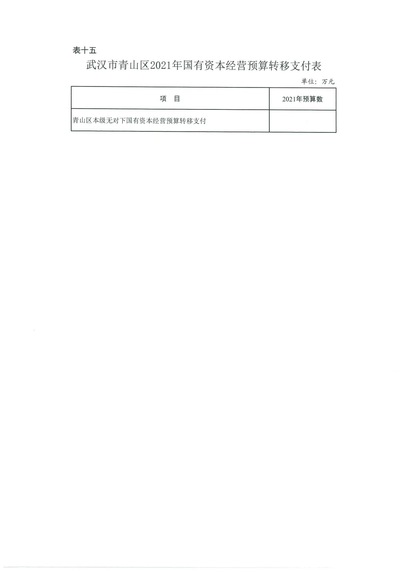 表十五、武汉市青山区2021年国有资本经营预算转移支付表