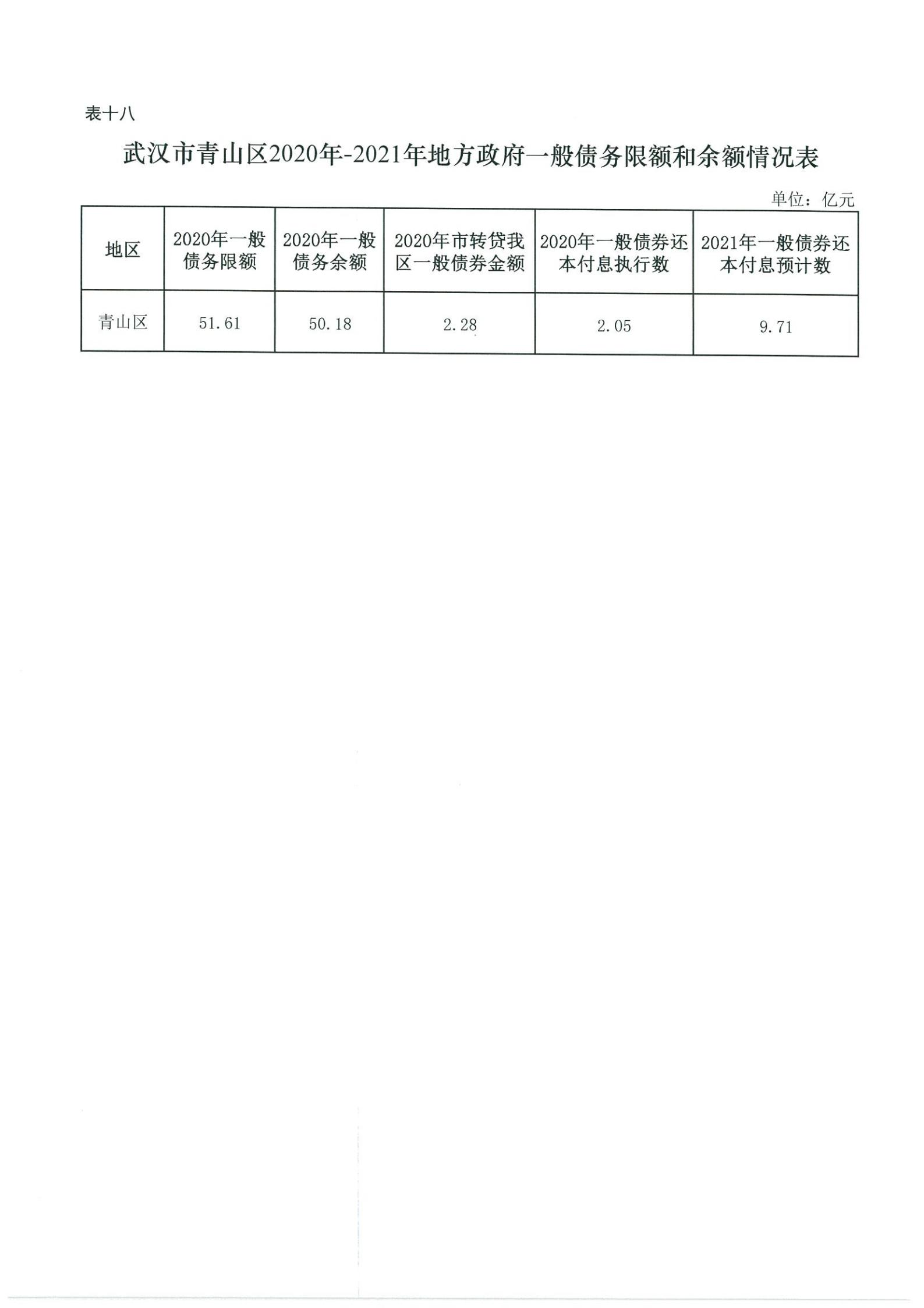 表十八、武汉市青山区2020年-2021年地方政府一般债务限额和余额情况表
