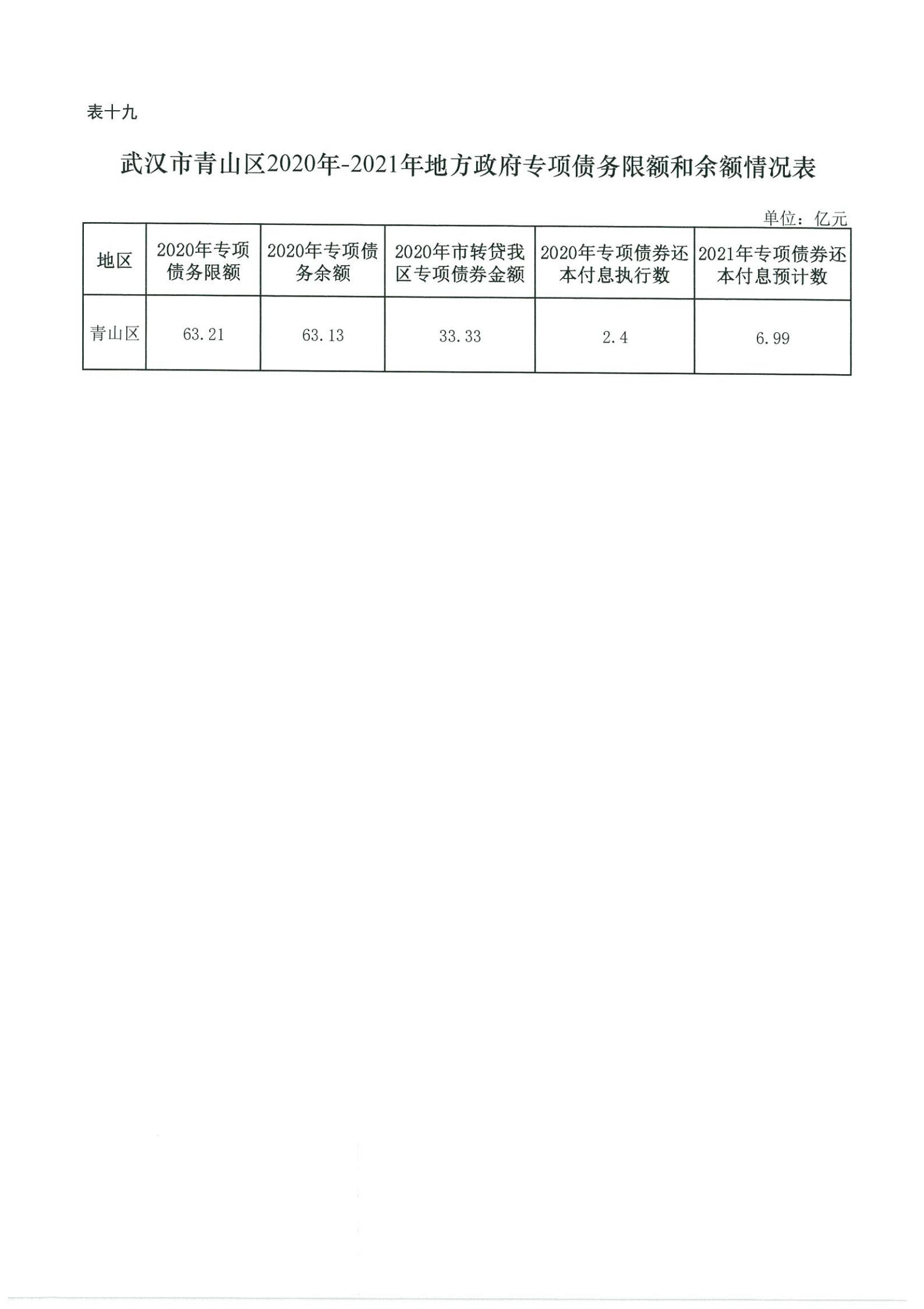 表十九、武汉市青山区2020年-2021年地方政府专项债务限额和余额情况表