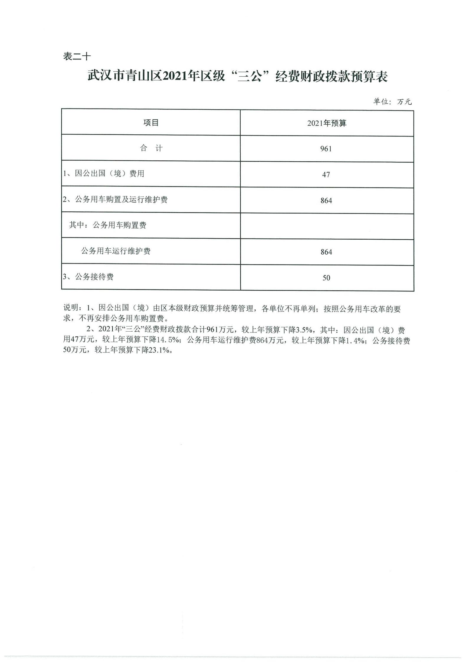 表二十、武汉市青山区2021年区级“三公”经费财政拨款预算表