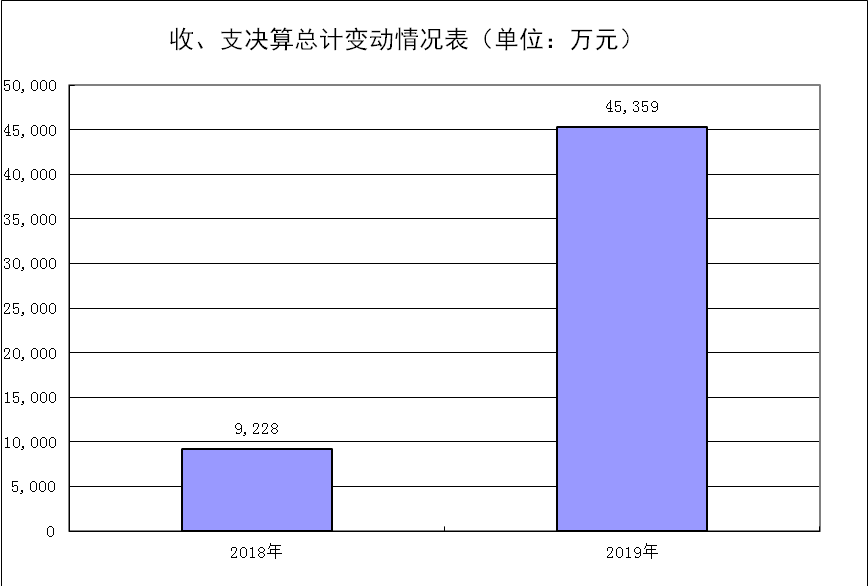 2019年度收、支总计45,359.05万元。与2018年相比,收、支总计各增加36,131.24万元,增长391.6%,主要原因一是上级下达保障房安居工程专项资金34,800万元,本年全部支出用于购建公租房;二是军运会立面整治工程相关支出比去年有所增加。
