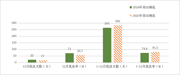 图1 2025年12月、1-12月青山钢花与去年同期优良天数及优良率