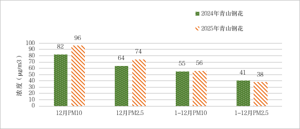 图2 2025年12月、1-12月青山钢花与去年同期PM10和PM2.5浓度