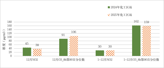 图6 2025年12月、1-12月化工区与去年同期NO2和O3_8h第90百分位数浓度